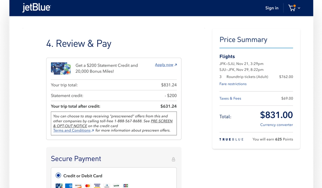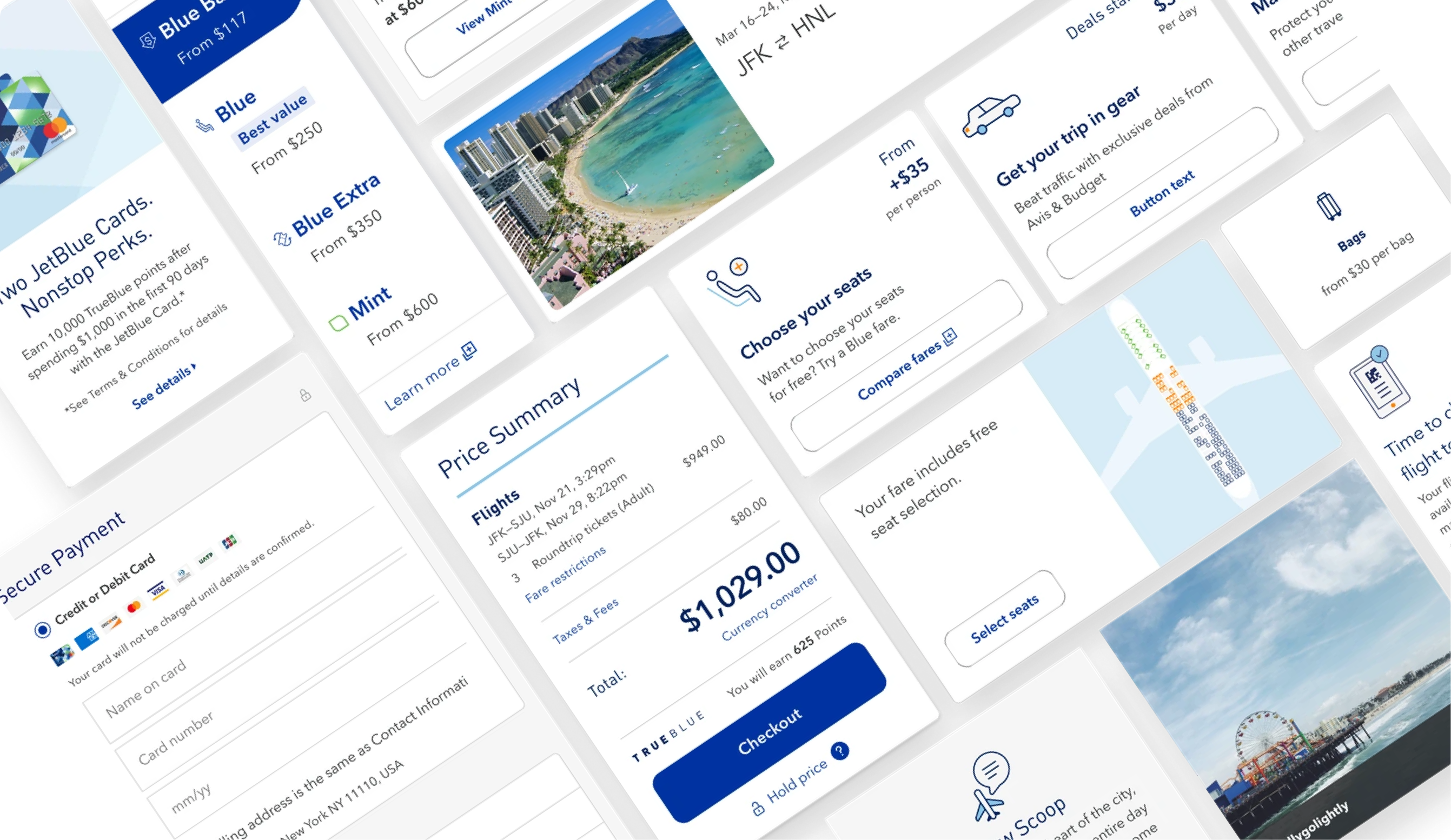 Enables JetBlue card upsells, flexible payments, and travel credit use—reinforcing reward and trip control in one place.