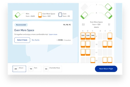 An immersive way to select your seats that upsells that responds as the customer scrolls through different segments.